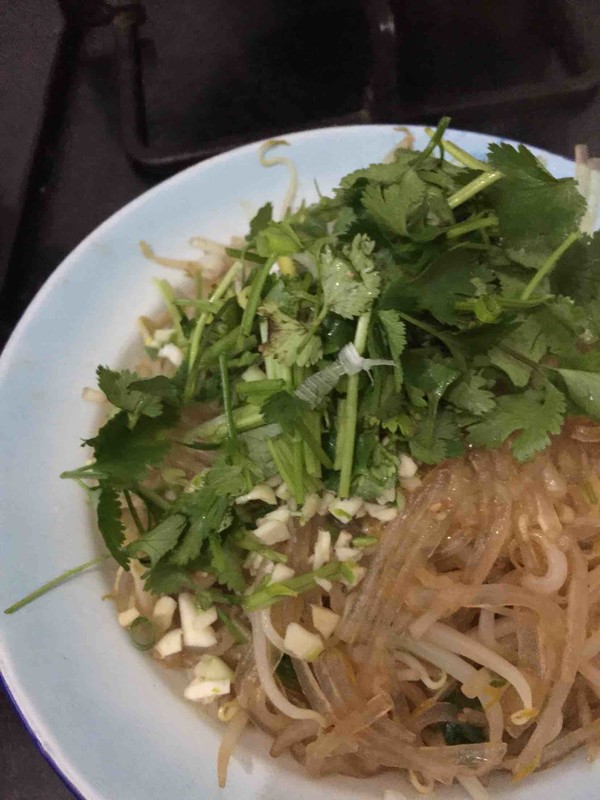 炒好的豆芽拌在一起。出锅,香菜,葱花。蒜泥。