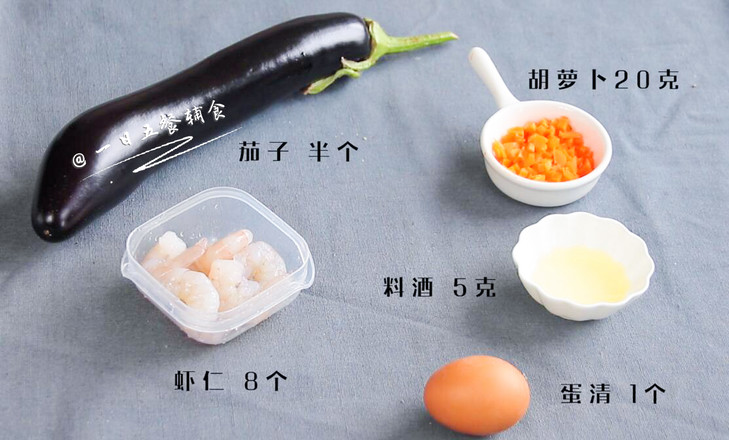 食材:茄子 半个,虾仁 8个,蛋清 1个,胡萝卜20克,食用油 10克,料酒 5克