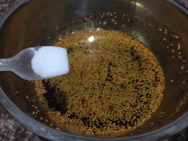 继续把锅里面的油加热至冒烟,分2-3次倒入辣椒面中,边倒要边搅拌。搅拌好后加入盐、糖、花椒粉搅匀。