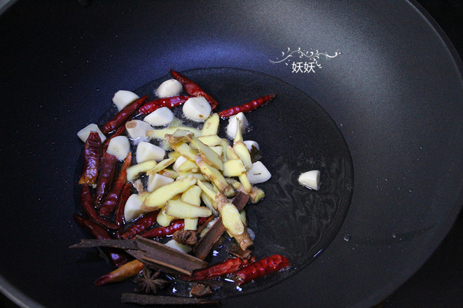 油锅烧热,下香料炒香。