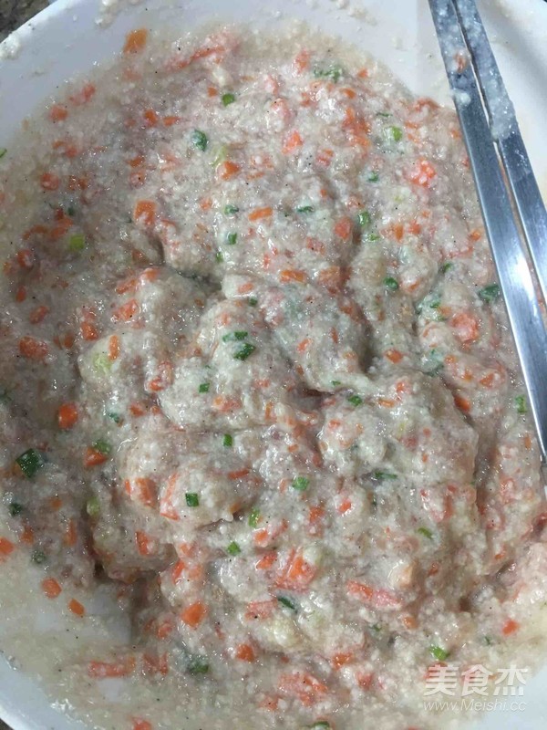 馅里放料酒、盐、生抽、蚝油、胡椒粉、生粉和面粉,搅拌成厚糊状