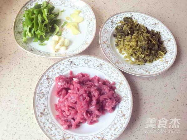 牛肉切丝,咸菜切粒,大蒜子剥皮,青椒切丝。