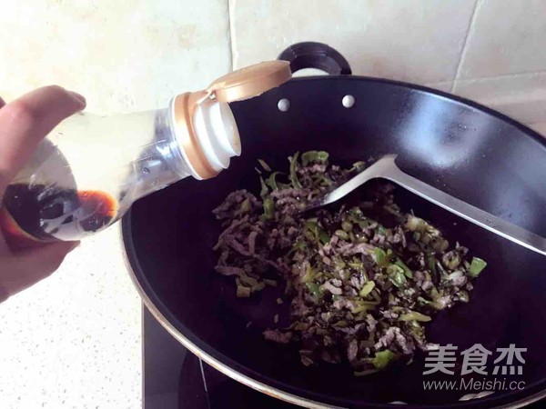 生姜稍作煸炒出香味,牛肉丝入锅煸炒