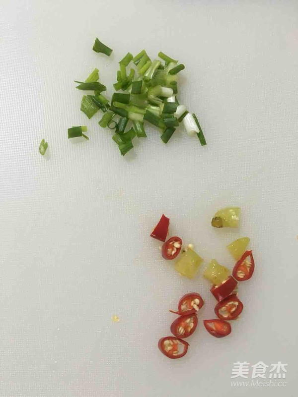 5.辣椒,泡椒,葱,切碎,根据自己的口味,喜欢吃辣的,可以多放点辣椒。